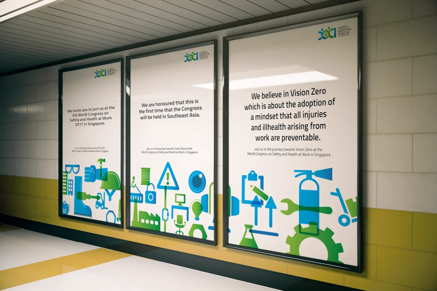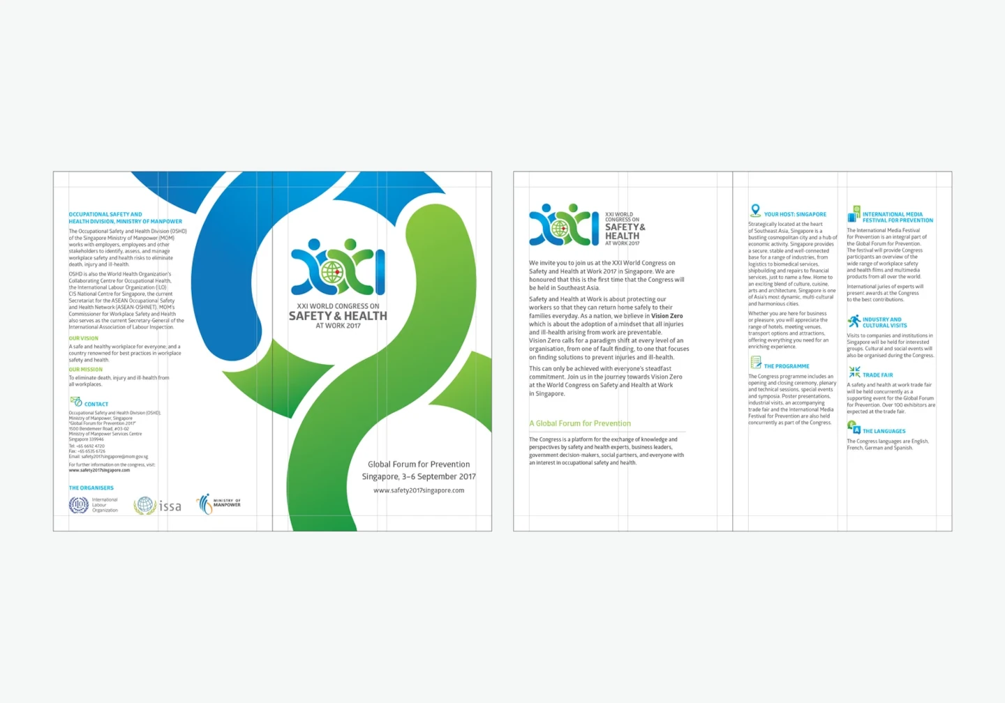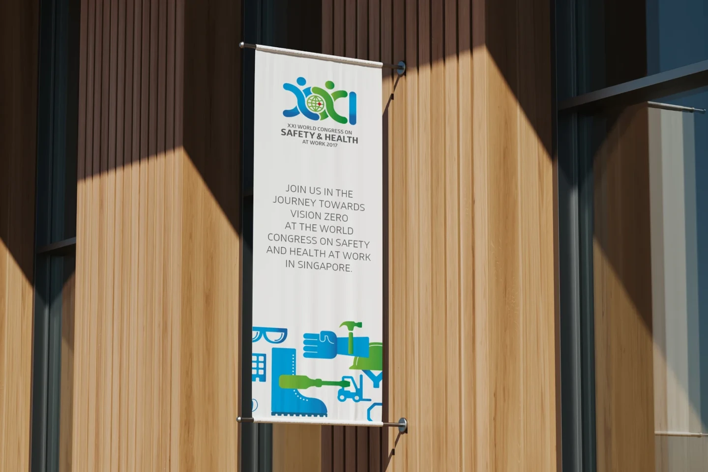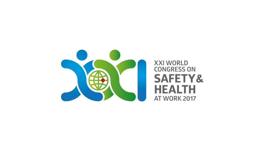 Two human figures joining hands around a globe is symbolic of the global pursuit of better workplace safety standards – the focus of the congress on safety and health at work. A roman numerical form of XXI marks the year.